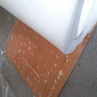Lay the padding down flat on the plywood. Once you have it in place, lift each side by rolling it back off the board. Dabbing your glue all over, this technique gives you freedom of motion without having to constantly make sure you are square. Do this for each side and make sure you get the corners well. Do not clamp the foam to the board. With wet glue on a porous surface, clamping can make the glue go into the tiny holes of the foam and can eventually harden the wrong area or possibly risk glueing it to the board squished. Just lay something heavy on top of it for an hour or so to dry. While your waiting for it to dry, you can begin cutting your fabric and batting.
