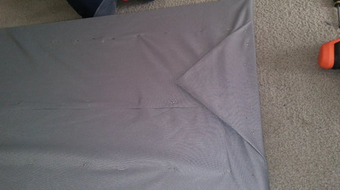 I laid out the fabric flat on the carpet and placed by foam and board on top of it. Making sure all of my sides were even and straight. From here, it was just a matter of getting up the guts to attach the thing and not worry if it was perfect.